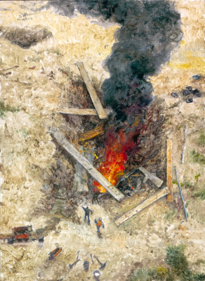 In 1982 Squeak Carnwath made an extensive series of fire paintings, including the following images. “I’ve always been phobic about fire,” she says. “I was carried out of a house on fire as a child and I averted a number of studio fires including one involving a pile of sawdust and a hotplate. Immolation has a finality to it.”